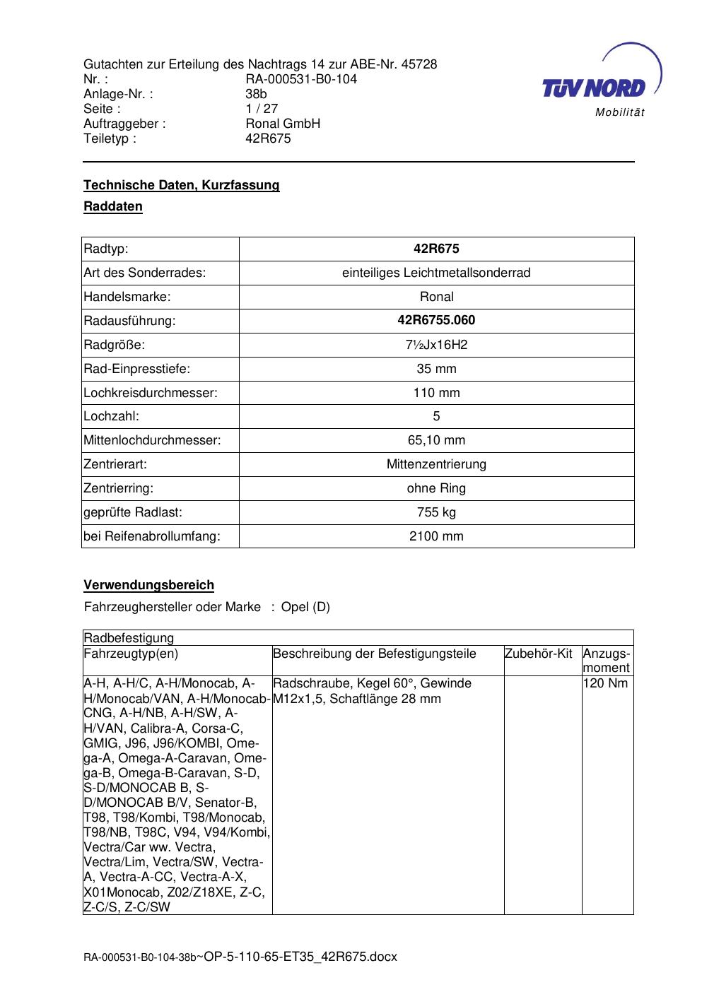 Dieses Gutachten (abe) bezieht sich auf die Alufelge Ronal 42R675 in der Ausführung ET 0, Mittenloch 0 mm (KBA 45728). Im PDF findest du typischerweise zulässige Reifengrößen, Auflagen/Anbauhinweise und – je nach Dokument – Hinweise zur Eintragung.