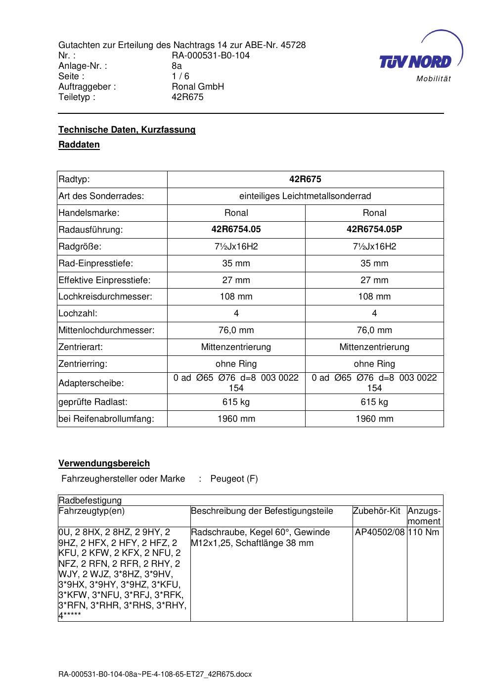 • Stimmt die KBA-Nummer auf der Felge mit diesem Dokument überein?