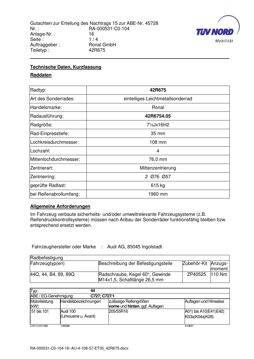 Dieses abe gehört zur Felge Ronal 42R675 in 7Jx15 ET0 mit KBA 45728. Die Seite ist dafür gedacht, dass du schnell prüfen kannst, ob KBA, Design und Größe zu deiner Felge passen und danach direkt das richtige PDF lädst.