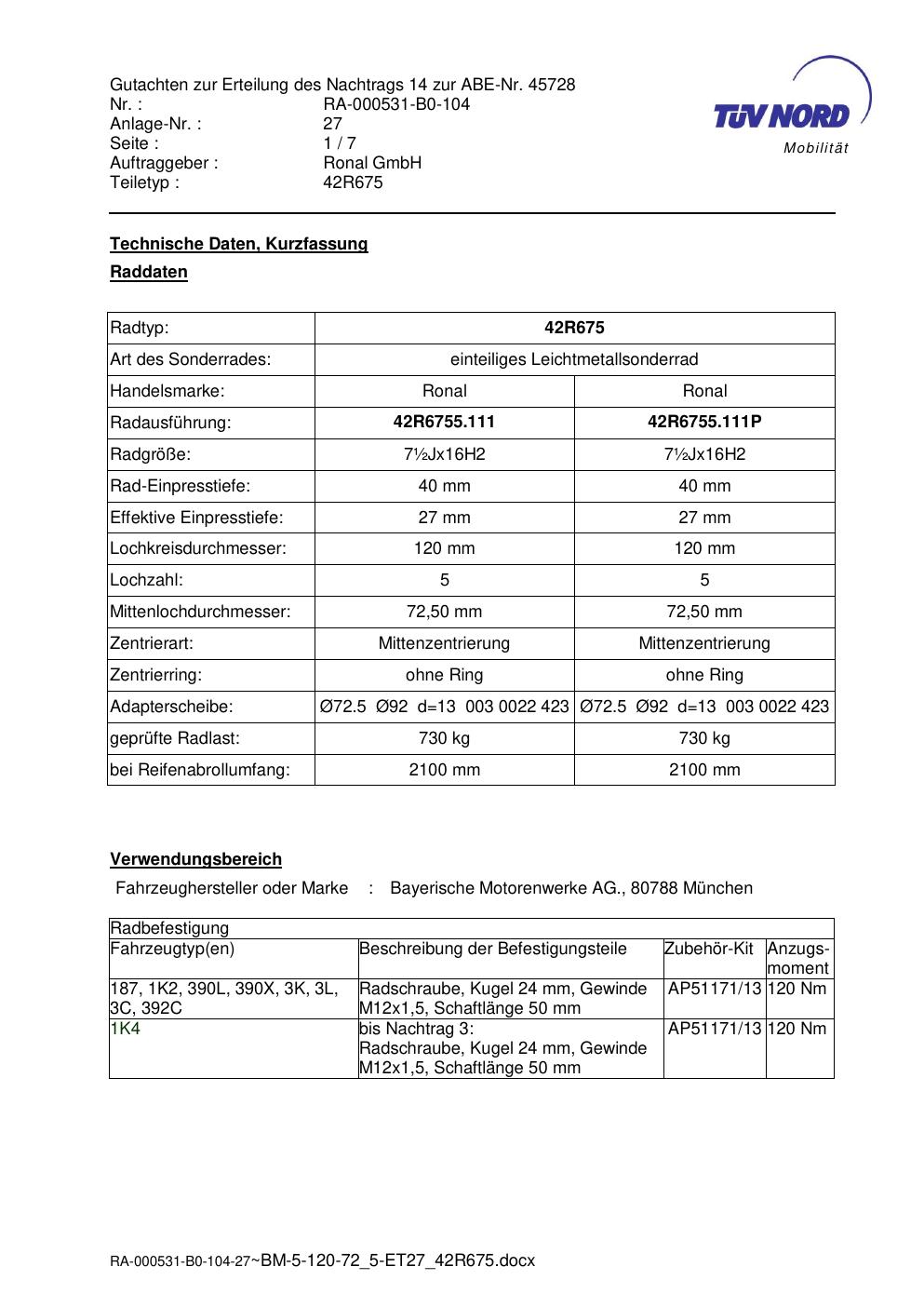 • Stimmt die KBA-Nummer auf der Felge mit diesem Dokument überein?
