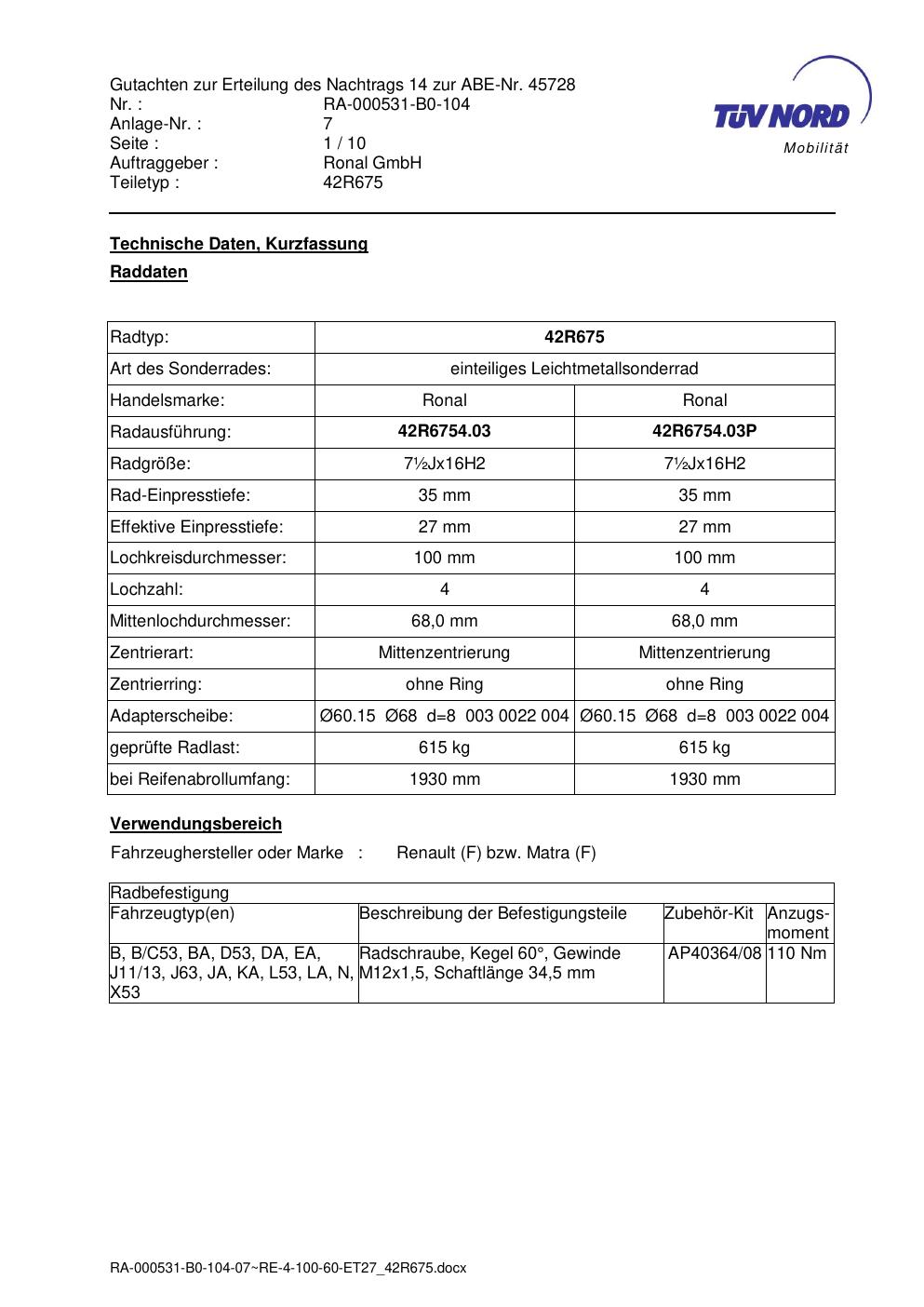 • Stimmt die KBA-Nummer auf der Felge mit diesem Dokument überein?