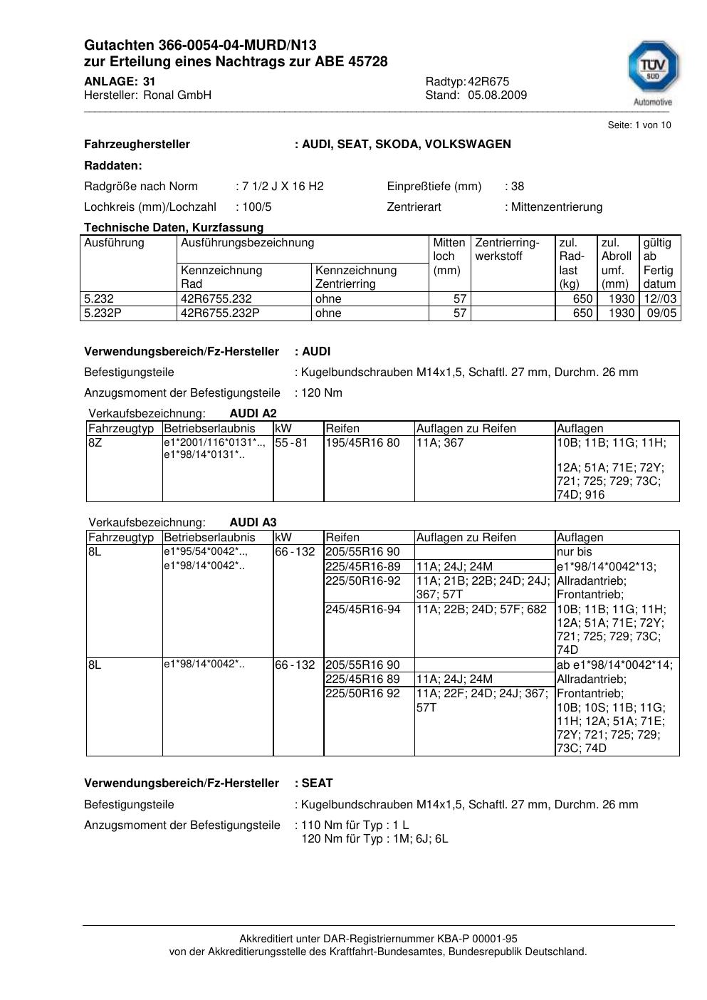 Dieses Gutachten (abe) bezieht sich auf die Alufelge Ronal 42R675 in der Ausführung 2Jx16 ET 0, Mittenloch 0 mm (KBA 45728). Im PDF findest du typischerweise zulässige Reifengrößen, Auflagen/Anbauhinweise und – je nach Dokument – Hinweise zur Eintragung.