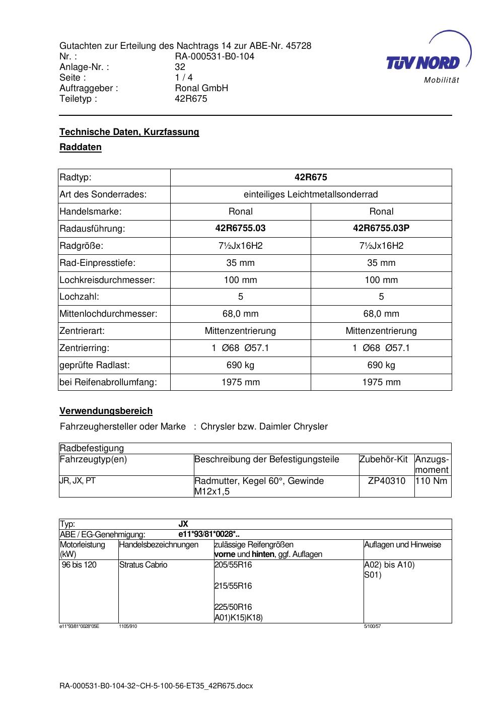 Dieses Gutachten (abe) bezieht sich auf die Alufelge Ronal 42R675 in der Ausführung ET 0, Mittenloch 0 mm (KBA 45728). Im PDF findest du typischerweise zulässige Reifengrößen, Auflagen/Anbauhinweise und – je nach Dokument – Hinweise zur Eintragung.