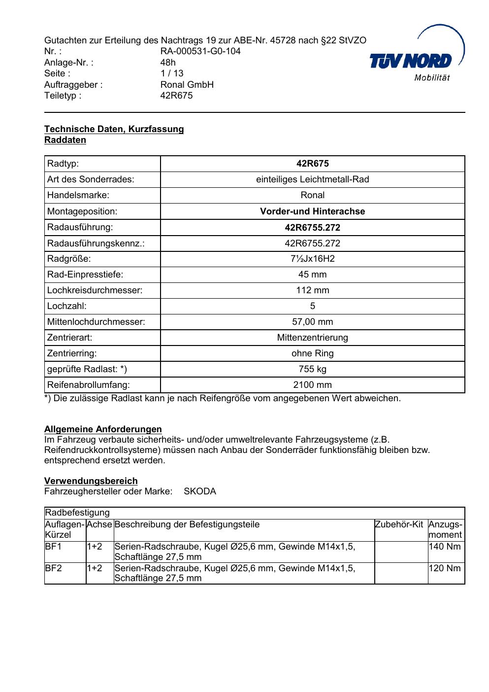 Dieses Gutachten (abe) bezieht sich auf die Alufelge Ronal 42R675 in der Ausführung ET 0, Mittenloch 0 mm (KBA 45728). Im PDF findest du typischerweise zulässige Reifengrößen, Auflagen/Anbauhinweise und – je nach Dokument – Hinweise zur Eintragung.