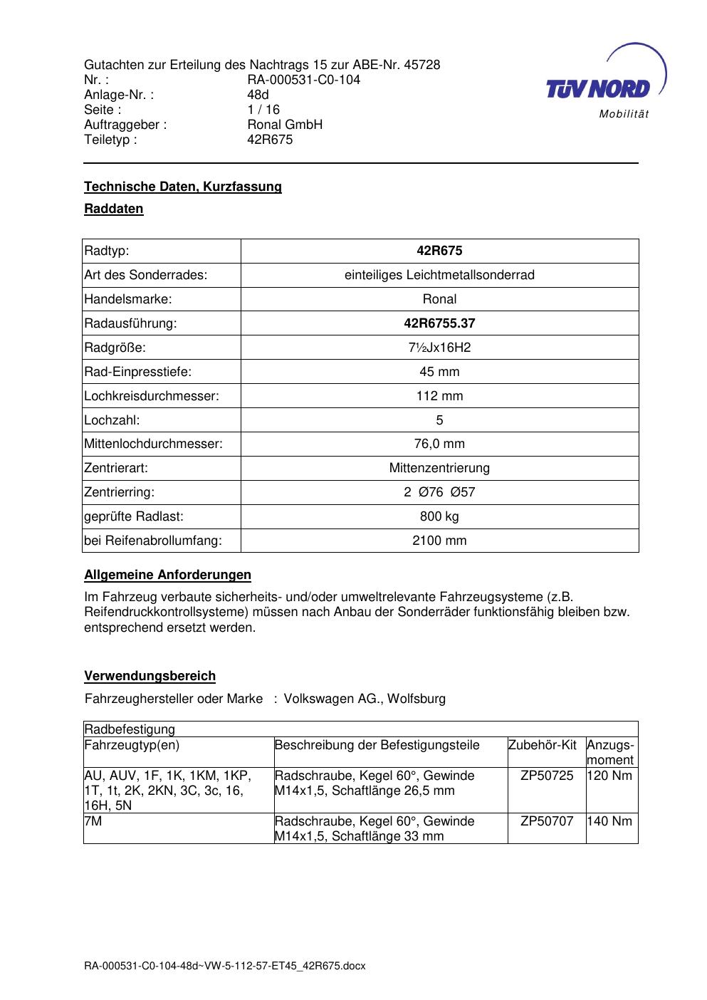 Dieses Gutachten (abe) bezieht sich auf die Alufelge Ronal 42R675 in der Ausführung ET 0, Mittenloch 0 mm (KBA 45728). Im PDF findest du typischerweise zulässige Reifengrößen, Auflagen/Anbauhinweise und – je nach Dokument – Hinweise zur Eintragung.