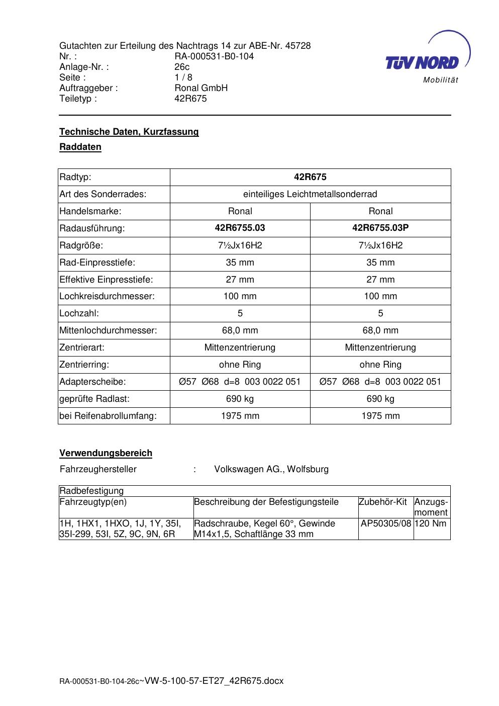 Dieses Gutachten (abe) bezieht sich auf die Alufelge Ronal 42R675 in der Ausführung ET 0, Mittenloch 0 mm (KBA 45728). Im PDF findest du typischerweise zulässige Reifengrößen, Auflagen/Anbauhinweise und – je nach Dokument – Hinweise zur Eintragung.