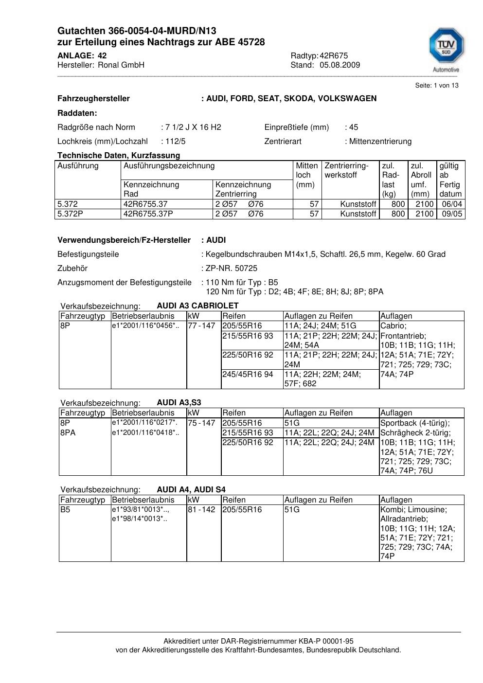 Dieses Gutachten (abe) bezieht sich auf die Alufelge Ronal 42R675 in der Ausführung 2Jx16 ET 0, Mittenloch 0 mm (KBA 45728). Im PDF findest du typischerweise zulässige Reifengrößen, Auflagen/Anbauhinweise und – je nach Dokument – Hinweise zur Eintragung.