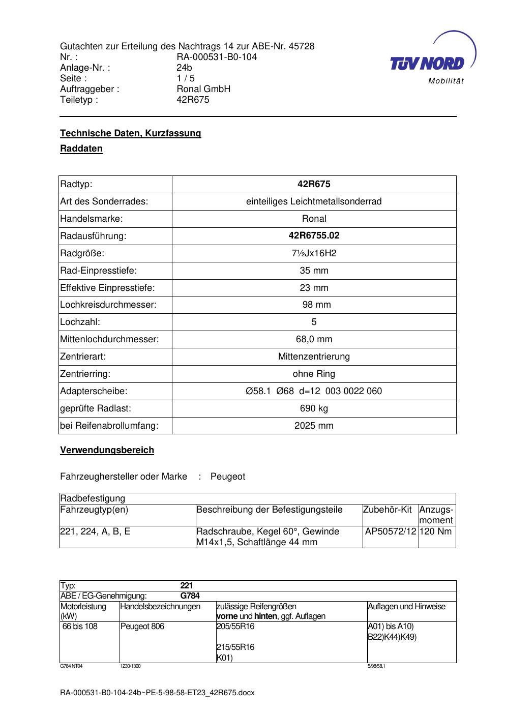 Dieses Gutachten (abe) bezieht sich auf die Alufelge Ronal 42R675 in der Ausführung ET 0, Mittenloch 0 mm (KBA 45728). Im PDF findest du typischerweise zulässige Reifengrößen, Auflagen/Anbauhinweise und – je nach Dokument – Hinweise zur Eintragung.