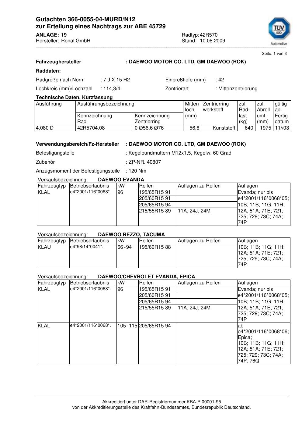 Dieses Gutachten (abe) bezieht sich auf die Alufelge Ronal 42R570 in der Ausführung 7Jx15 ET 0, Mittenloch 0 mm (KBA 45729). Im PDF findest du typischerweise zulässige Reifengrößen, Auflagen/Anbauhinweise und – je nach Dokument – Hinweise zur Eintragung.