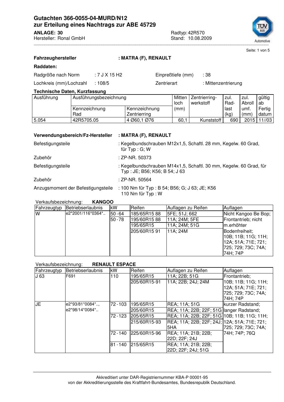 Dieses Gutachten (abe) bezieht sich auf die Alufelge Ronal 42R570 in der Ausführung 7Jx15 ET 0, Mittenloch 0 mm (KBA 45729). Im PDF findest du typischerweise zulässige Reifengrößen, Auflagen/Anbauhinweise und – je nach Dokument – Hinweise zur Eintragung.