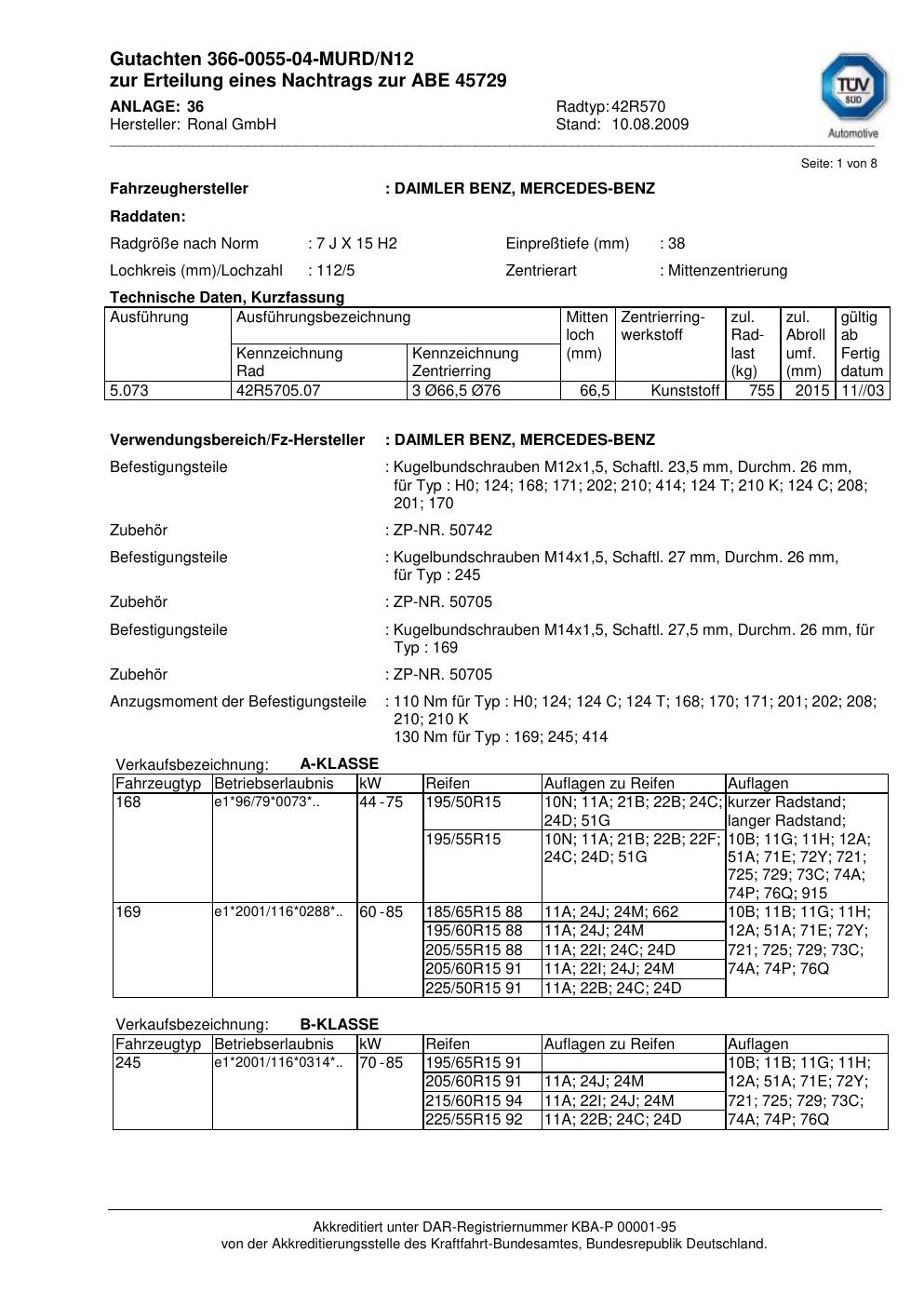 Dieses Gutachten (abe) bezieht sich auf die Alufelge Ronal 42R570 in der Ausführung 7Jx15 ET 0, Mittenloch 0 mm (KBA 45729). Im PDF findest du typischerweise zulässige Reifengrößen, Auflagen/Anbauhinweise und – je nach Dokument – Hinweise zur Eintragung.