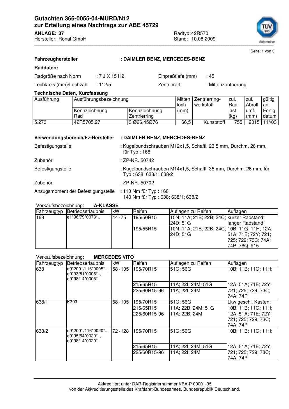 Dieses Gutachten (abe) bezieht sich auf die Alufelge Ronal 42R570 in der Ausführung 7Jx15 ET 0, Mittenloch 0 mm (KBA 45729). Im PDF findest du typischerweise zulässige Reifengrößen, Auflagen/Anbauhinweise und – je nach Dokument – Hinweise zur Eintragung.