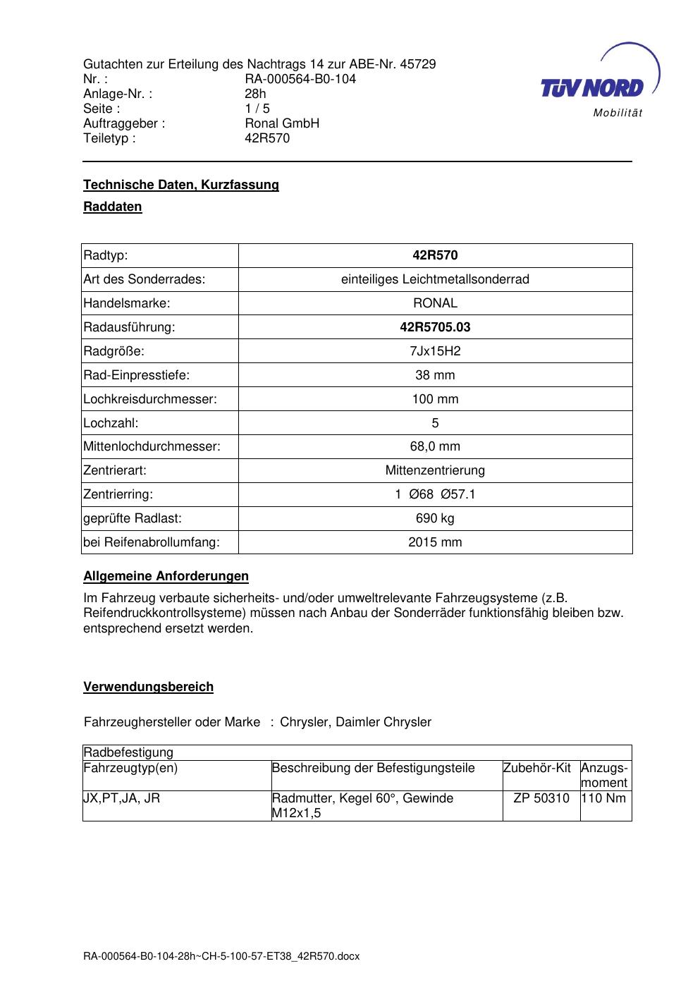 Dieses Gutachten (abe) bezieht sich auf die Alufelge brand-ronal 42R570 in der Ausführung 7Jx15 ET 0, Mittenloch 0 mm (KBA 45729). Im PDF findest du typischerweise zulässige Reifengrößen, Auflagen/Anbauhinweise und – je nach Dokument – Hinweise zur Eintragung.