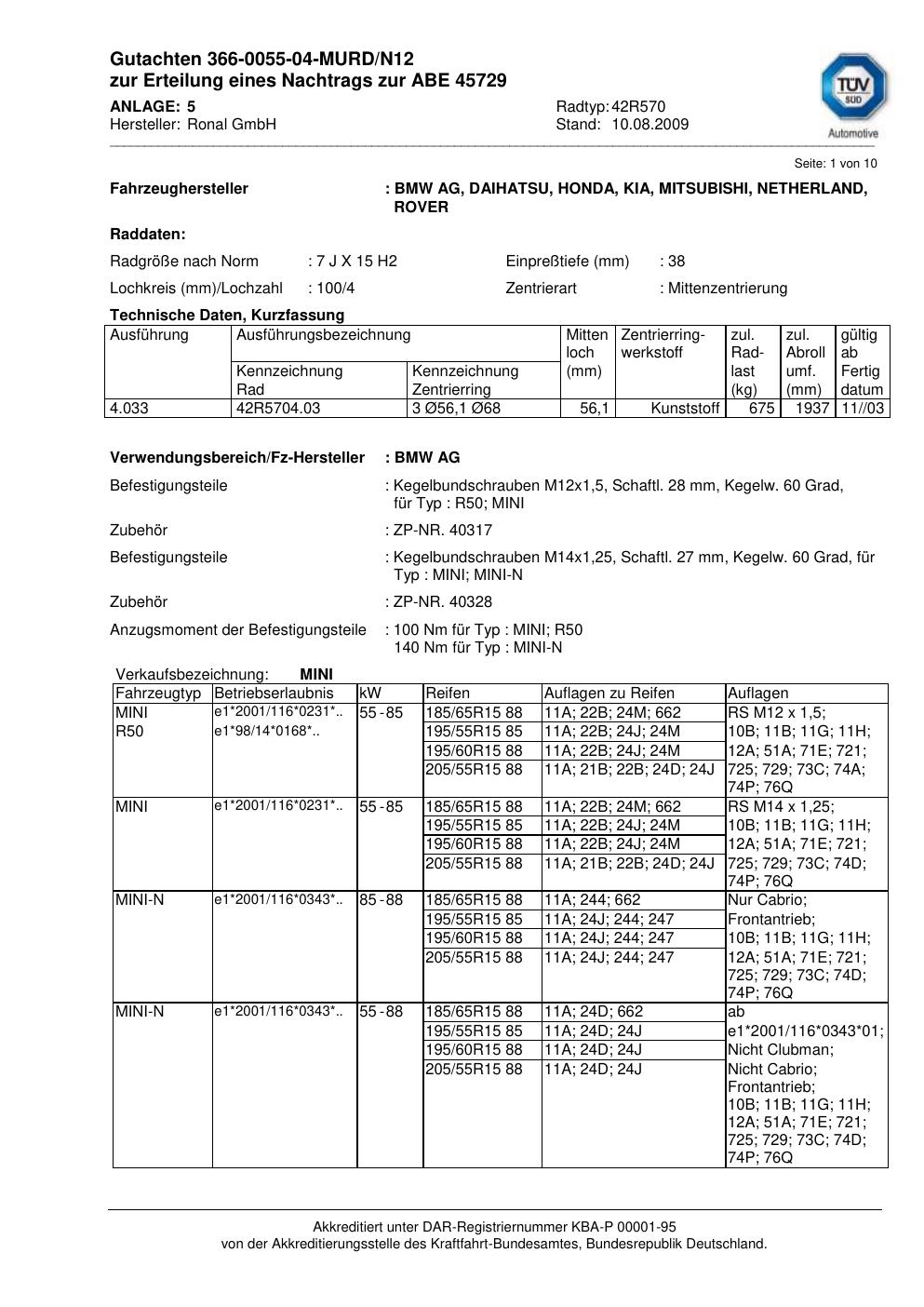 Dieses Gutachten (abe) bezieht sich auf die Alufelge Ronal 42R570 in der Ausführung 7Jx15 ET 0, Mittenloch 0 mm (KBA 45729). Im PDF findest du typischerweise zulässige Reifengrößen, Auflagen/Anbauhinweise und – je nach Dokument – Hinweise zur Eintragung.