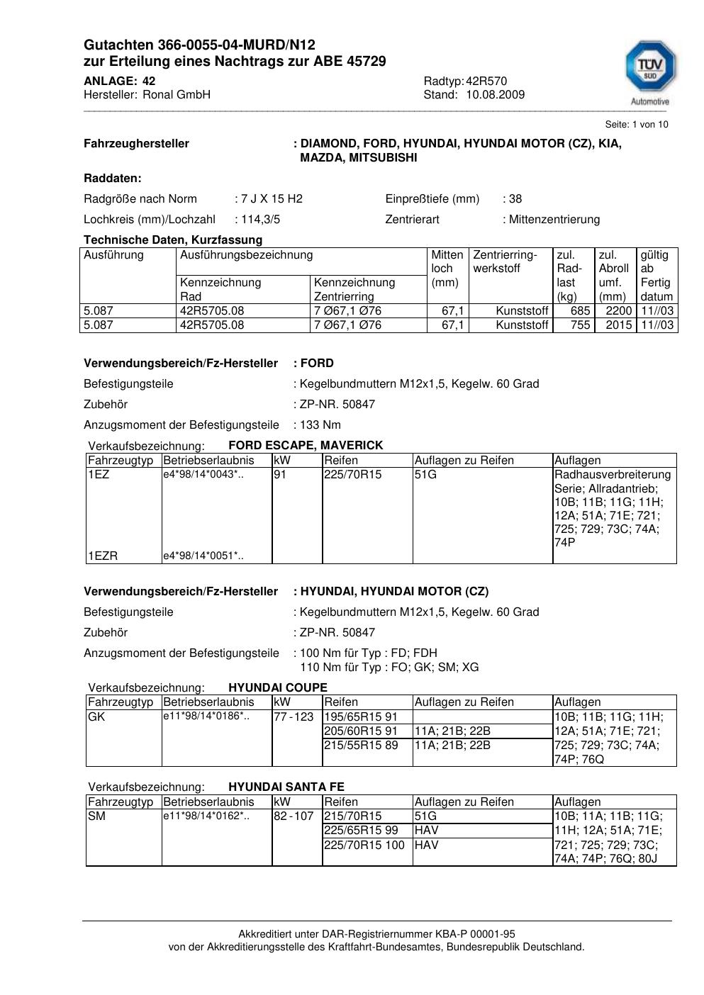 Dieses Gutachten (abe) bezieht sich auf die Alufelge Ronal 42R570 in der Ausführung 7Jx15 ET 0, Mittenloch 0 mm (KBA 45729). Im PDF findest du typischerweise zulässige Reifengrößen, Auflagen/Anbauhinweise und – je nach Dokument – Hinweise zur Eintragung.