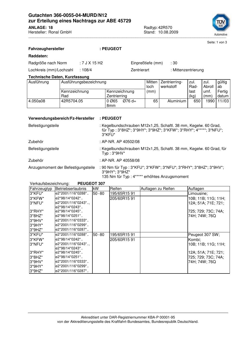 Dieses Gutachten (abe) bezieht sich auf die Alufelge brand-ronal 42R570 in der Ausführung 7Jx15 ET 0, Mittenloch 0 mm (KBA 45729). Im PDF findest du typischerweise zulässige Reifengrößen, Auflagen/Anbauhinweise und – je nach Dokument – Hinweise zur Eintragung.