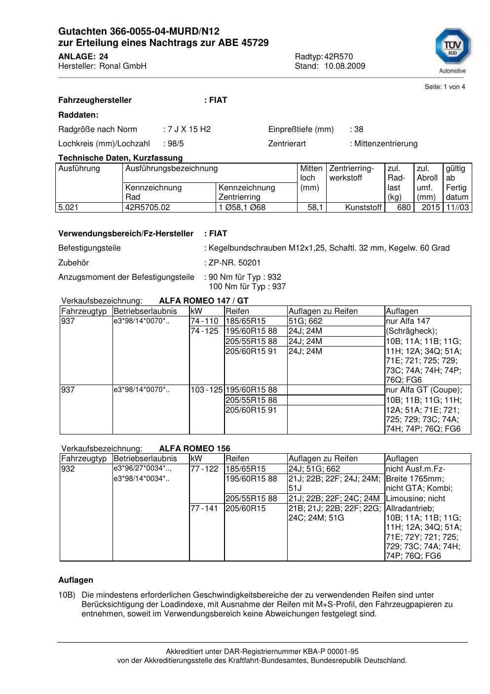 Dieses Gutachten (abe) bezieht sich auf die Alufelge Ronal 42R570 in der Ausführung 7Jx15 ET 0, Mittenloch 0 mm (KBA 45729). Im PDF findest du typischerweise zulässige Reifengrößen, Auflagen/Anbauhinweise und – je nach Dokument – Hinweise zur Eintragung.