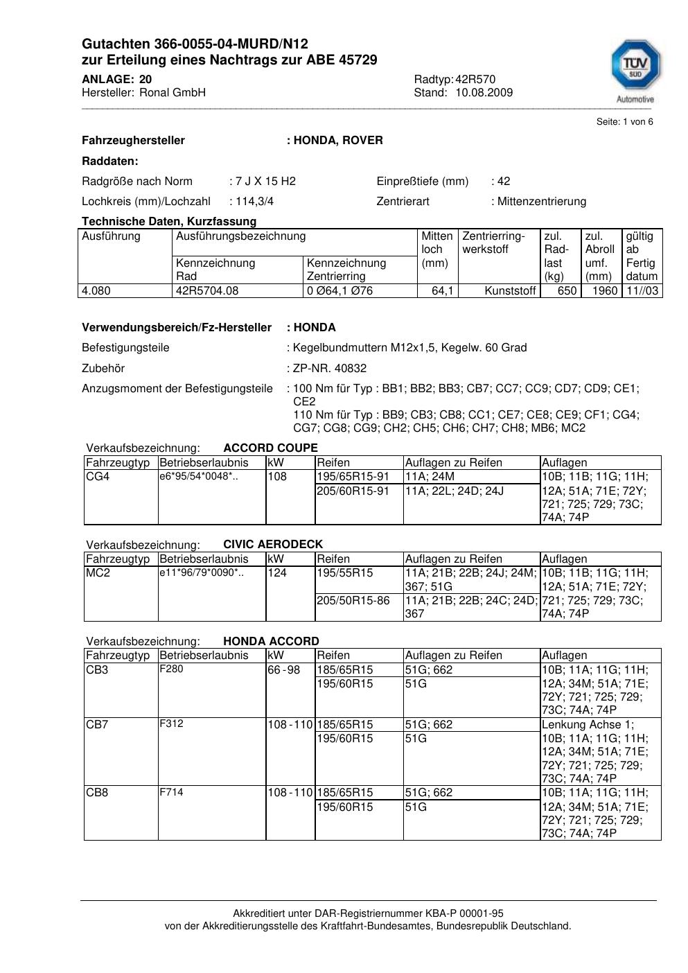 Dieses Gutachten (abe) bezieht sich auf die Alufelge Ronal 42R570 in der Ausführung 7Jx15 ET 0, Mittenloch 0 mm (KBA 45729). Im PDF findest du typischerweise zulässige Reifengrößen, Auflagen/Anbauhinweise und – je nach Dokument – Hinweise zur Eintragung.