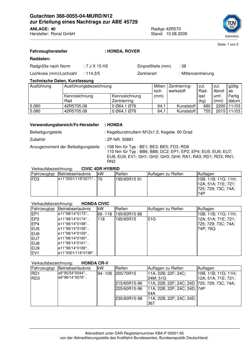 Dieses Gutachten (abe) bezieht sich auf die Alufelge Ronal 42R570 in der Ausführung 7Jx15 ET 0, Mittenloch 0 mm (KBA 45729). Im PDF findest du typischerweise zulässige Reifengrößen, Auflagen/Anbauhinweise und – je nach Dokument – Hinweise zur Eintragung.