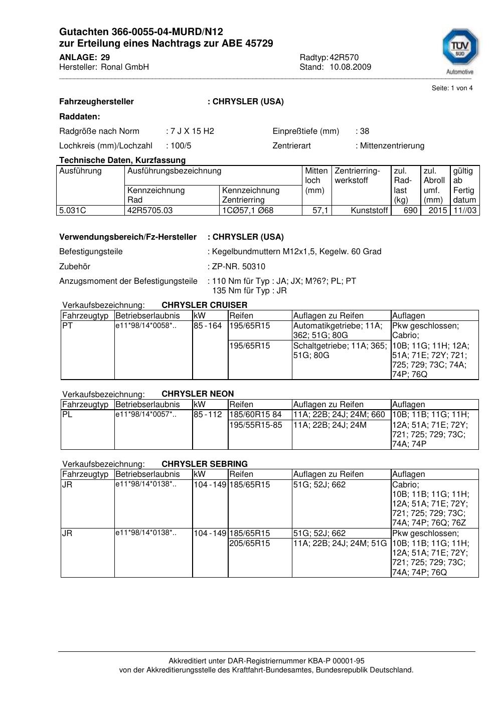 Dieses Gutachten (abe) bezieht sich auf die Alufelge Ronal 42R570 in der Ausführung 7Jx15 ET 0, Mittenloch 0 mm (KBA 45729). Im PDF findest du typischerweise zulässige Reifengrößen, Auflagen/Anbauhinweise und – je nach Dokument – Hinweise zur Eintragung.