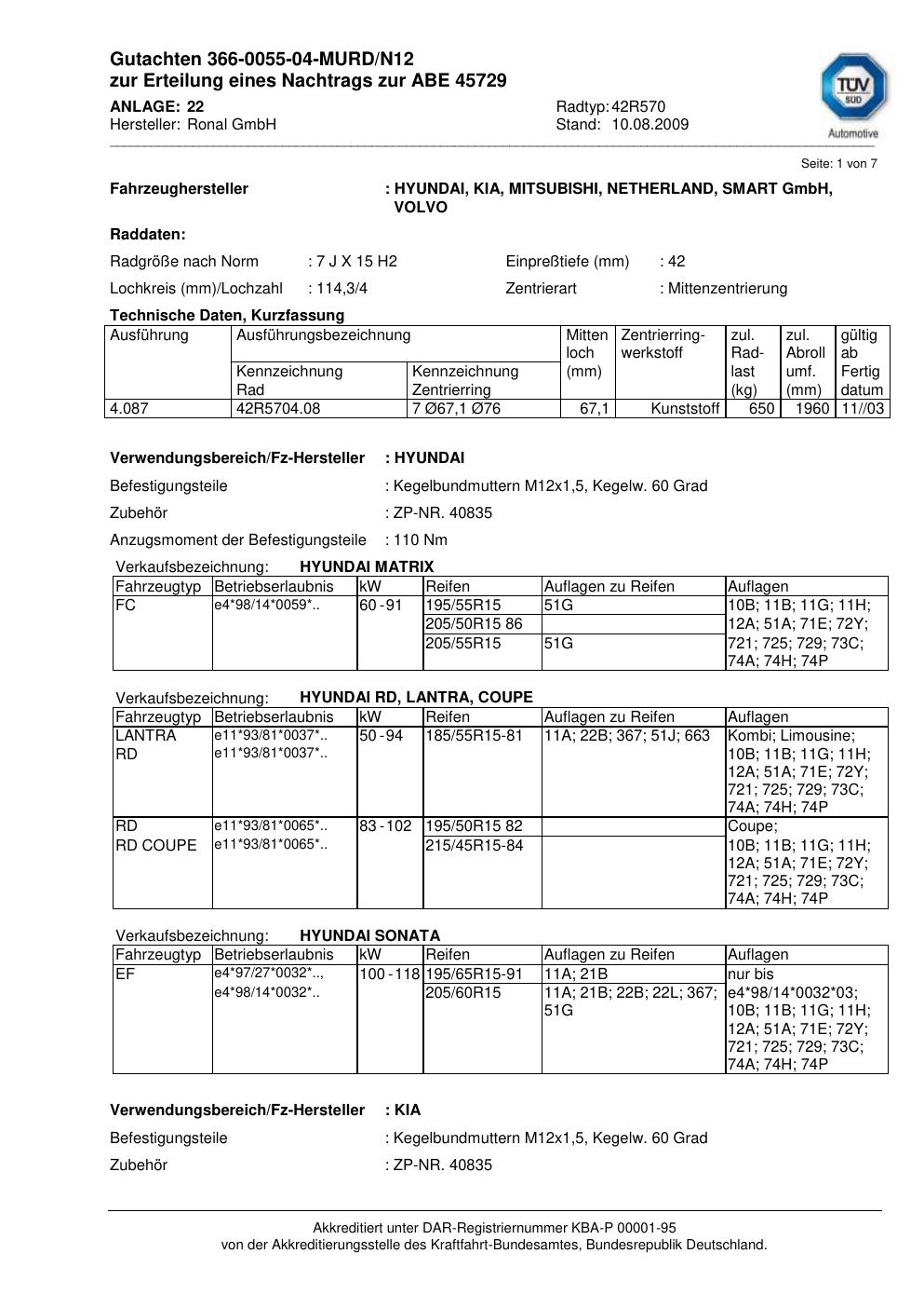 Dieses Gutachten (abe) bezieht sich auf die Alufelge Ronal 42R570 in der Ausführung 7Jx15 ET 0, Mittenloch 0 mm (KBA 45729). Im PDF findest du typischerweise zulässige Reifengrößen, Auflagen/Anbauhinweise und – je nach Dokument – Hinweise zur Eintragung.