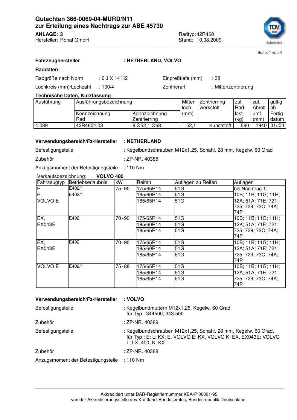 Felgengutachten / abe für Alufelgen Ronal 42R460 (6Jx14 ET 0, Mittenloch 0 mm) mit KBA 45730 (Zertifikatsnummer 45730). Hier kostenlos als PDF herunterladen. Der Download-Link ist 24 Stunden gültig und kann bis zu zwei Mal verwendet werden.