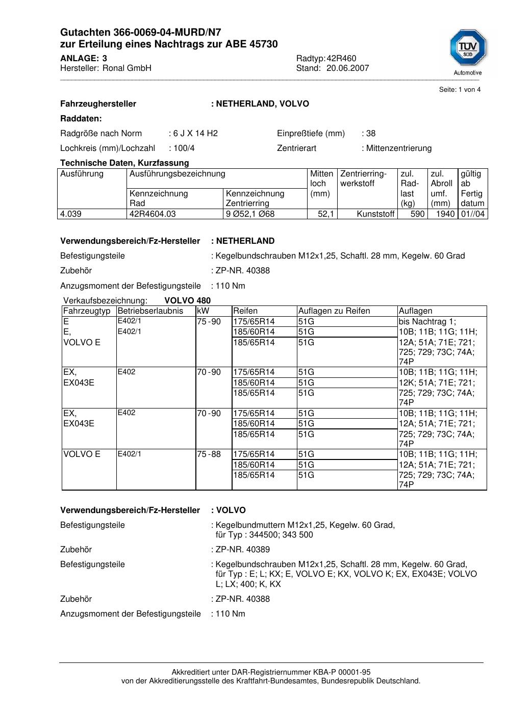 Felgengutachten / abe für Alufelgen Ronal 42R460 (6Jx14 ET 0, Mittenloch 0 mm) mit KBA 45730 (Zertifikatsnummer 45730). Hier kostenlos als PDF herunterladen. Der Download-Link ist 24 Stunden gültig und kann bis zu zwei Mal verwendet werden.