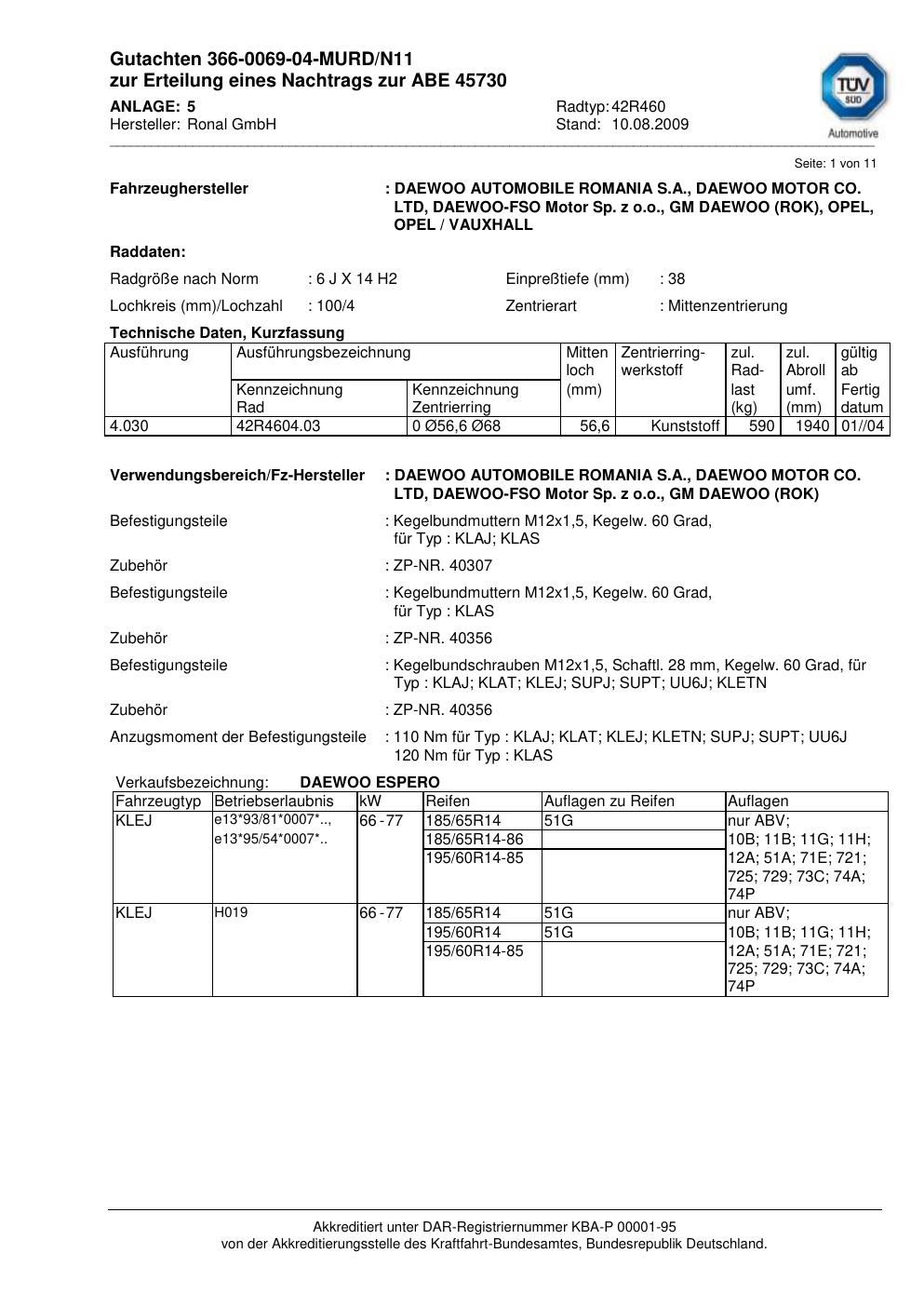 Dieses Gutachten (abe) bezieht sich auf die Alufelge Ronal 42R460 in der Ausführung 6Jx14 ET 0, Mittenloch 0 mm (KBA 45730). Im PDF findest du typischerweise zulässige Reifengrößen, Auflagen/Anbauhinweise und – je nach Dokument – Hinweise zur Eintragung.