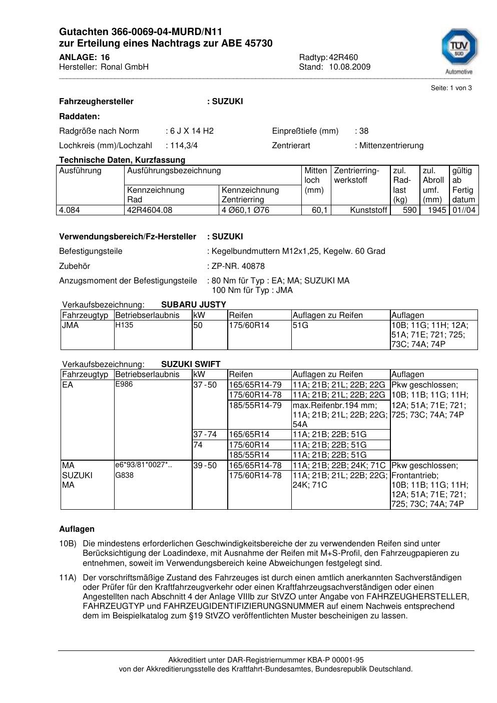 Dieses Gutachten (abe) bezieht sich auf die Alufelge Ronal 42R460 in der Ausführung 6Jx14 ET 0, Mittenloch 0 mm (KBA 45730). Im PDF findest du typischerweise zulässige Reifengrößen, Auflagen/Anbauhinweise und – je nach Dokument – Hinweise zur Eintragung.