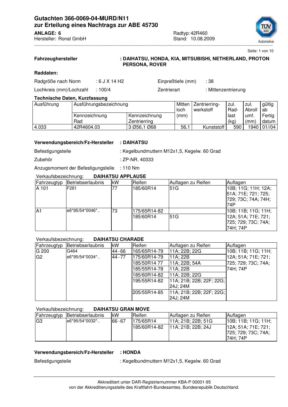 Felgengutachten / abe für Alufelgen Ronal 42R460 (6Jx14 ET 0, Mittenloch 0 mm) mit KBA 45730 (Zertifikatsnummer 45730). Hier kostenlos als PDF herunterladen. Der Download-Link ist 24 Stunden gültig und kann bis zu zwei Mal verwendet werden.