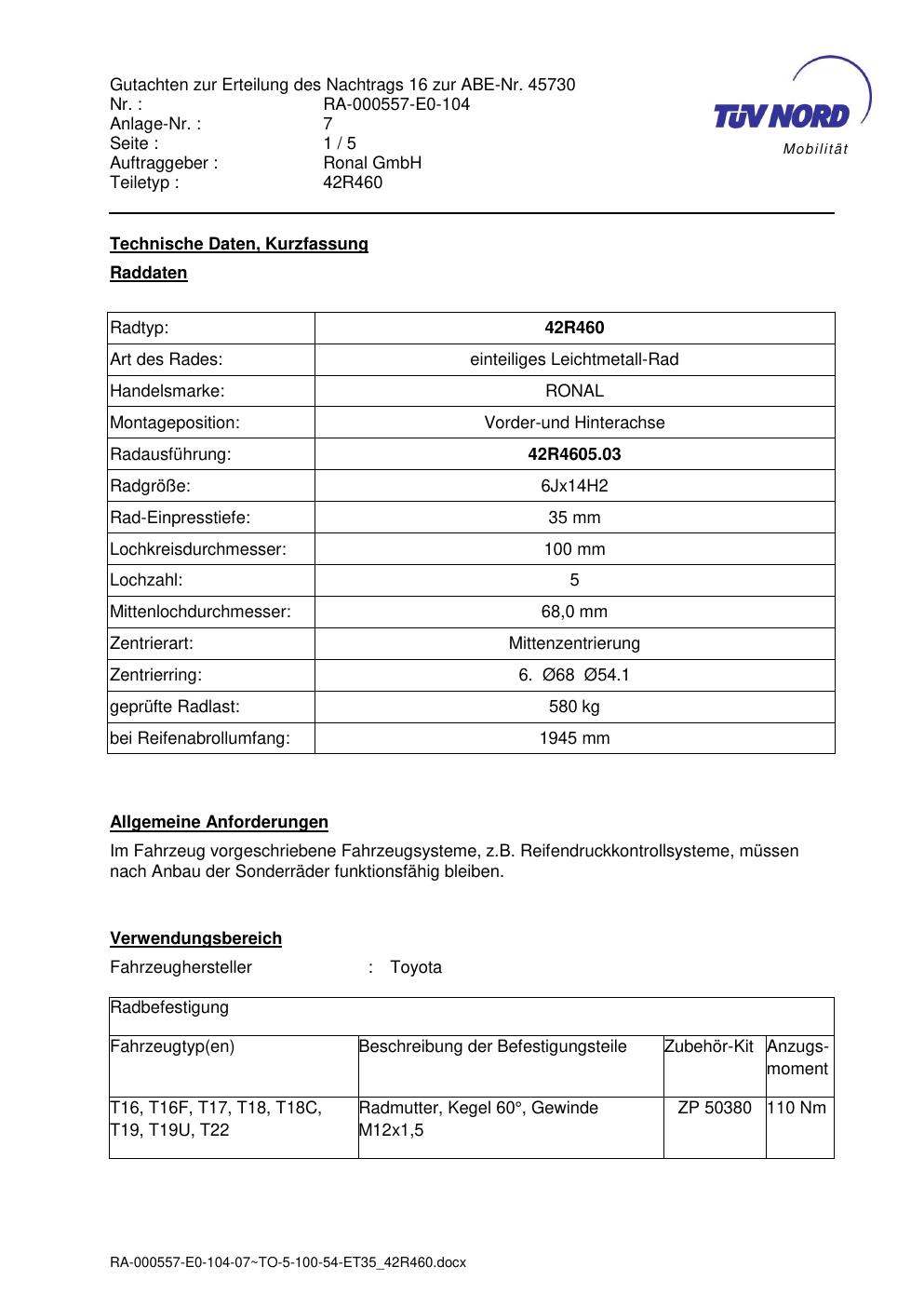 Dieses Gutachten (abe) bezieht sich auf die Alufelge brand-ronal 42R460 in der Ausführung 6Jx14 ET 0, Mittenloch 0 mm (KBA 45730). Im PDF findest du typischerweise zulässige Reifengrößen, Auflagen/Anbauhinweise und – je nach Dokument – Hinweise zur Eintragung.