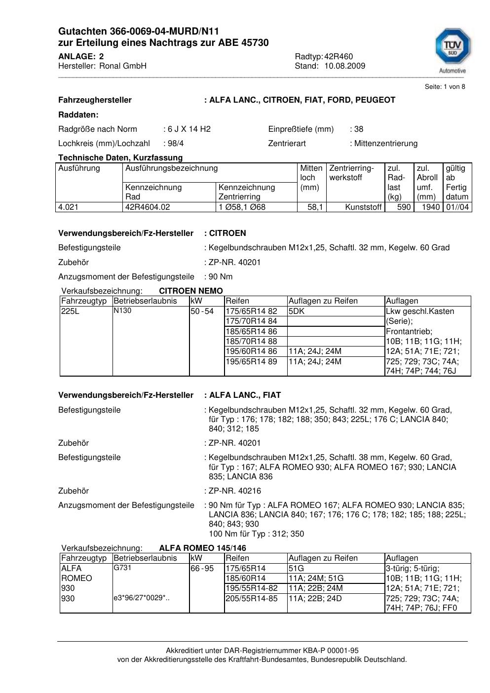 Felgengutachten / abe für Alufelgen Ronal 42R460 (6Jx14 ET 0, Mittenloch 0 mm) mit KBA 45730 (Zertifikatsnummer 45730). Hier kostenlos als PDF herunterladen. Der Download-Link ist 24 Stunden gültig und kann bis zu zwei Mal verwendet werden.