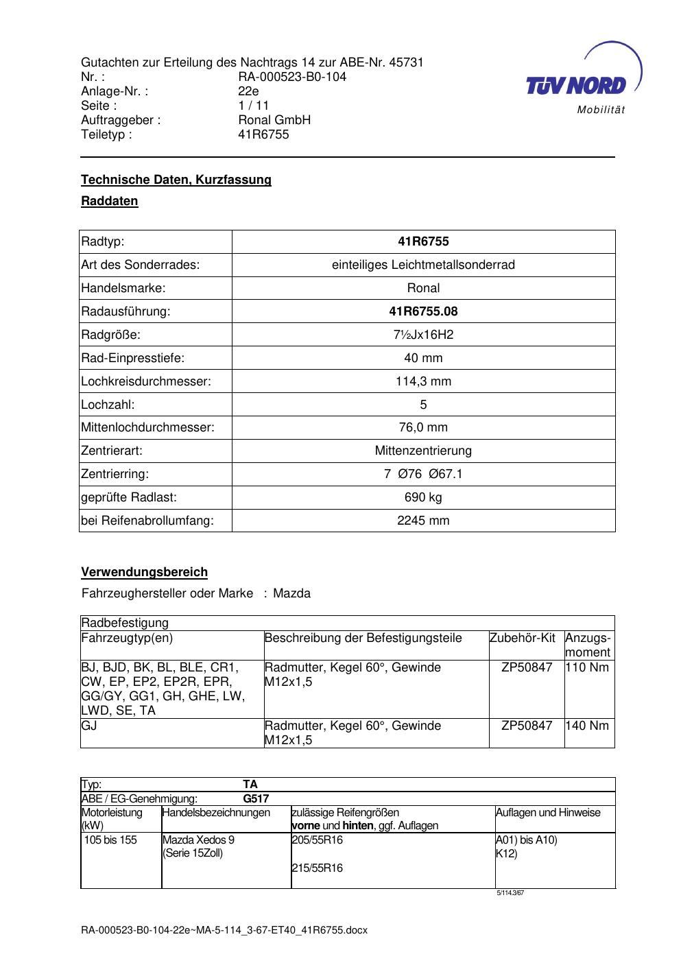 Dieses Gutachten (abe) bezieht sich auf die Alufelge brand-rial 41R6755 in der Ausführung ET 0, Mittenloch 0 mm (KBA 45731). Im PDF findest du typischerweise zulässige Reifengrößen, Auflagen/Anbauhinweise und – je nach Dokument – Hinweise zur Eintragung.