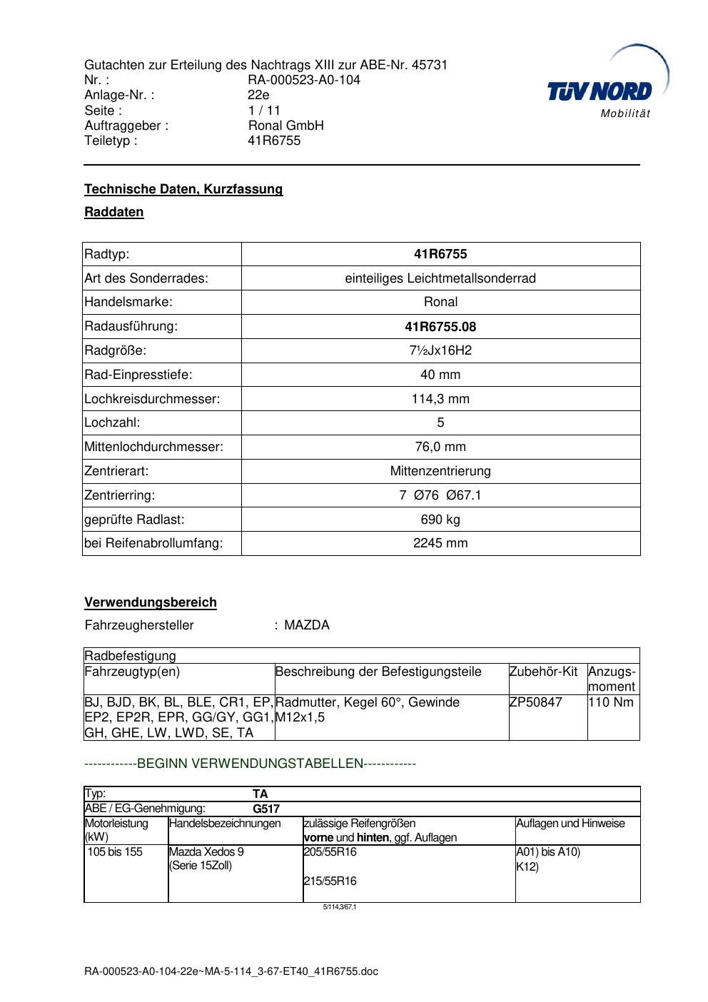 Dieses Gutachten (abe) bezieht sich auf die Alufelge brand-rial 41R6755 in der Ausführung ET 0, Mittenloch 0 mm (KBA 45731). Im PDF findest du typischerweise zulässige Reifengrößen, Auflagen/Anbauhinweise und – je nach Dokument – Hinweise zur Eintragung.