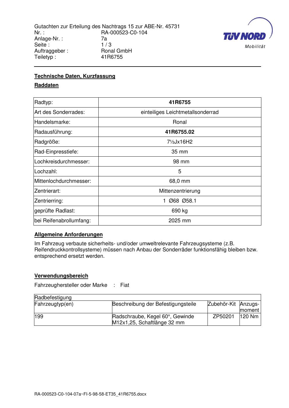 Dieses Gutachten (abe) bezieht sich auf die Alufelge brand-ronal 41R6755 in der Ausführung ET 0, Mittenloch 0 mm (KBA 45731). Im PDF findest du typischerweise zulässige Reifengrößen, Auflagen/Anbauhinweise und – je nach Dokument – Hinweise zur Eintragung.