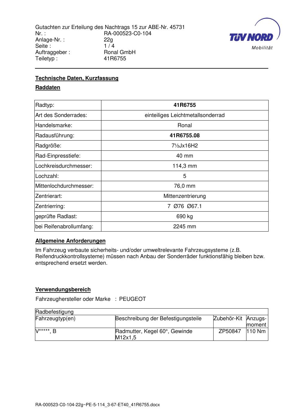 Dieses Gutachten (abe) bezieht sich auf die Alufelge brand-ronal 41R6755 in der Ausführung ET 0, Mittenloch 0 mm (KBA 45731). Im PDF findest du typischerweise zulässige Reifengrößen, Auflagen/Anbauhinweise und – je nach Dokument – Hinweise zur Eintragung.