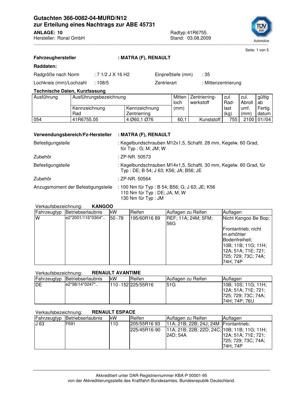 Dieses Gutachten (abe) bezieht sich auf die Alufelge Ronal 41R6755 in der Ausführung 2Jx16 ET 0, Mittenloch 0 mm (KBA 45731). Im PDF findest du typischerweise zulässige Reifengrößen, Auflagen/Anbauhinweise und – je nach Dokument – Hinweise zur Eintragung.