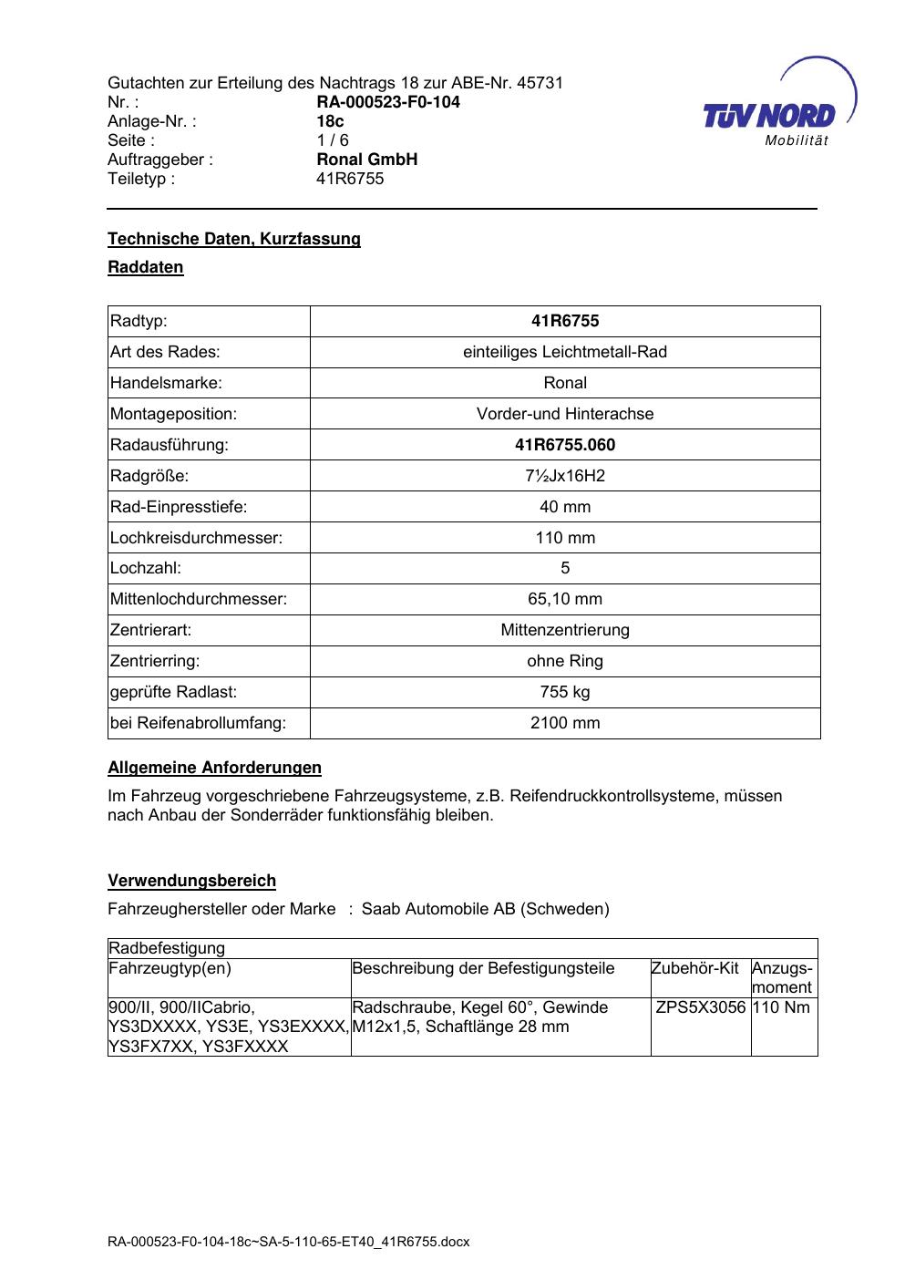 Dieses Gutachten (abe) bezieht sich auf die Alufelge brand-ronal 41R6755 in der Ausführung ET 0, Mittenloch 0 mm (KBA 45731). Im PDF findest du typischerweise zulässige Reifengrößen, Auflagen/Anbauhinweise und – je nach Dokument – Hinweise zur Eintragung.