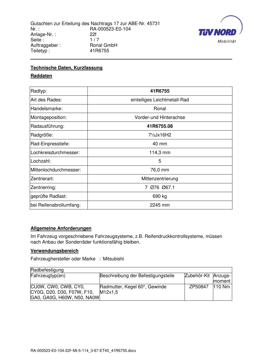Dieses Gutachten (abe) bezieht sich auf die Alufelge brand-ronal 41R6755 in der Ausführung ET 0, Mittenloch 0 mm (KBA 45731). Im PDF findest du typischerweise zulässige Reifengrößen, Auflagen/Anbauhinweise und – je nach Dokument – Hinweise zur Eintragung.