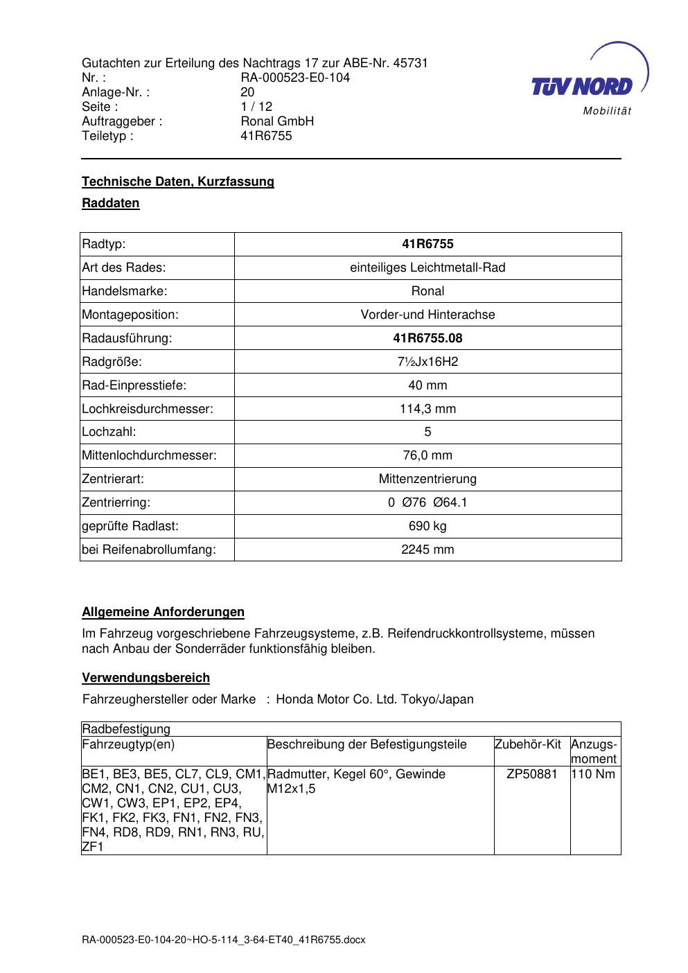 Dieses Gutachten (abe) bezieht sich auf die Alufelge brand-ronal 41R6755 in der Ausführung ET 0, Mittenloch 0 mm (KBA 45731). Im PDF findest du typischerweise zulässige Reifengrößen, Auflagen/Anbauhinweise und – je nach Dokument – Hinweise zur Eintragung.