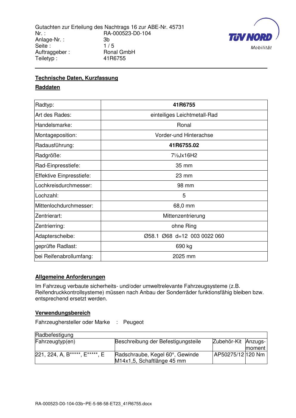 Dieses Gutachten (abe) bezieht sich auf die Alufelge brand-ronal 41R6755 in der Ausführung ET 0, Mittenloch 0 mm (KBA 45731). Im PDF findest du typischerweise zulässige Reifengrößen, Auflagen/Anbauhinweise und – je nach Dokument – Hinweise zur Eintragung.