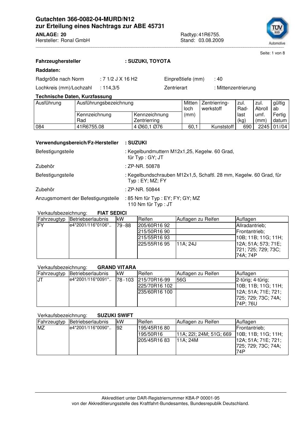 Dieses Gutachten (abe) bezieht sich auf die Alufelge Ronal 41R6755 in der Ausführung 2Jx16 ET 0, Mittenloch 0 mm (KBA 45731). Im PDF findest du typischerweise zulässige Reifengrößen, Auflagen/Anbauhinweise und – je nach Dokument – Hinweise zur Eintragung.