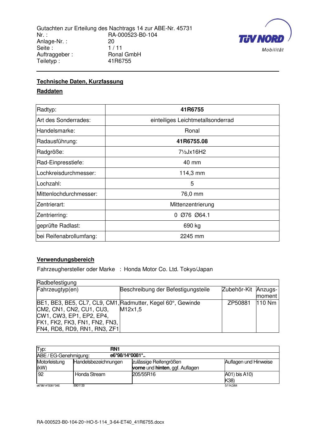 Dieses Gutachten (abe) bezieht sich auf die Alufelge brand-ronal 41R6755 in der Ausführung ET 0, Mittenloch 0 mm (KBA 45731). Im PDF findest du typischerweise zulässige Reifengrößen, Auflagen/Anbauhinweise und – je nach Dokument – Hinweise zur Eintragung.