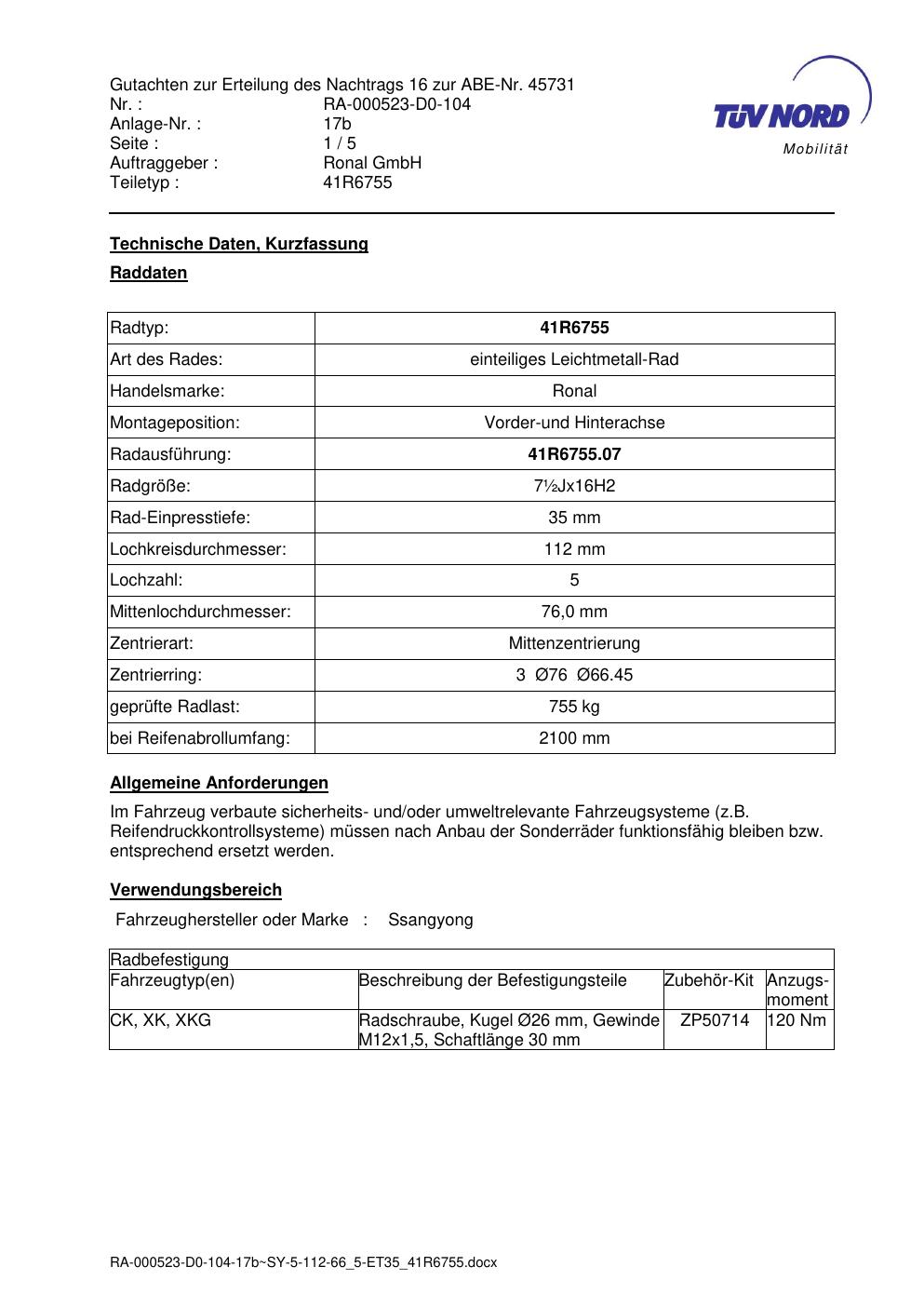 Dieses Gutachten (abe) bezieht sich auf die Alufelge brand-ronal 41R6755 in der Ausführung ET 0, Mittenloch 0 mm (KBA 45731). Im PDF findest du typischerweise zulässige Reifengrößen, Auflagen/Anbauhinweise und – je nach Dokument – Hinweise zur Eintragung.