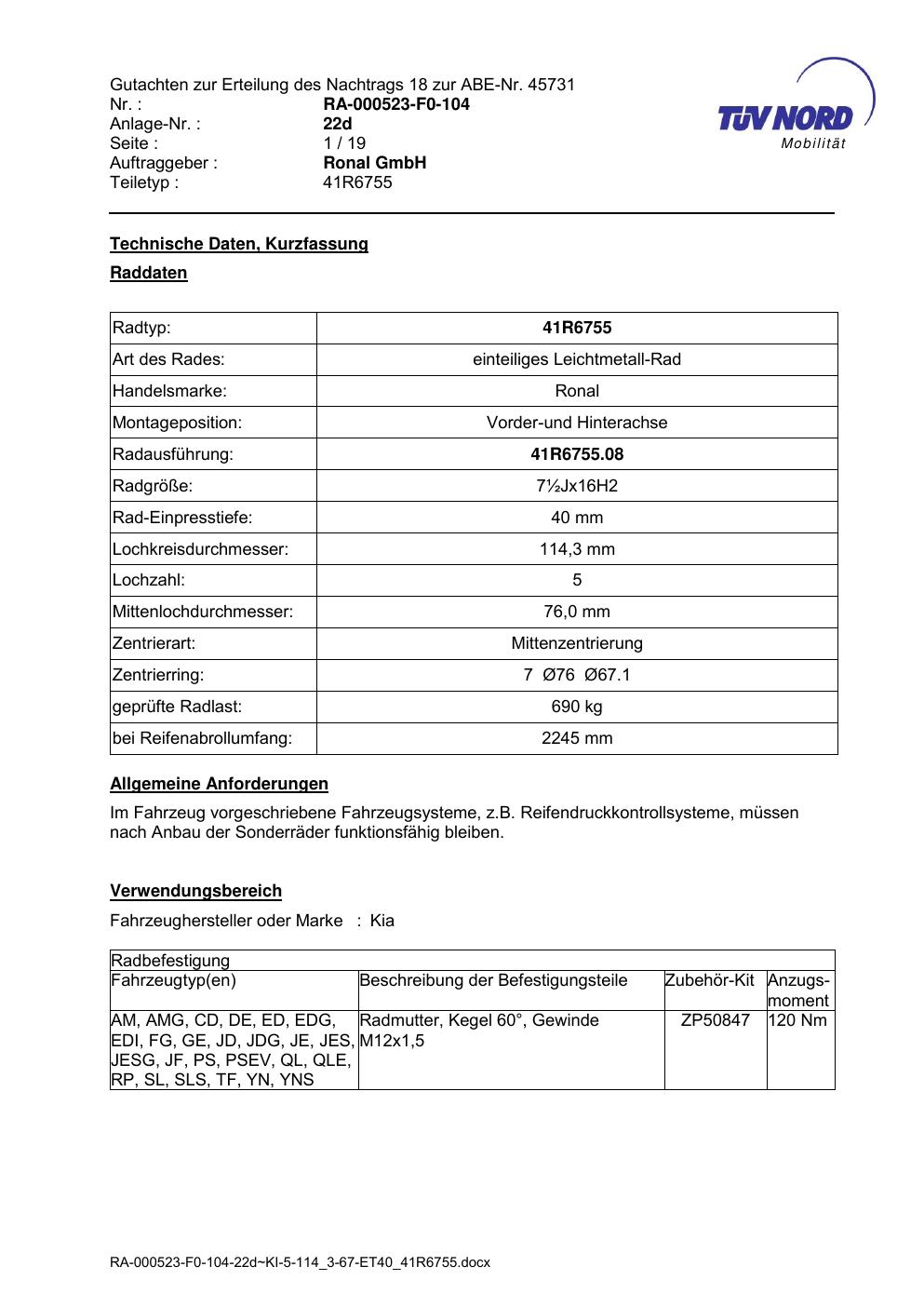 Dieses Gutachten (abe) bezieht sich auf die Alufelge brand-ronal 41R6755 in der Ausführung ET 0, Mittenloch 0 mm (KBA 45731). Im PDF findest du typischerweise zulässige Reifengrößen, Auflagen/Anbauhinweise und – je nach Dokument – Hinweise zur Eintragung.