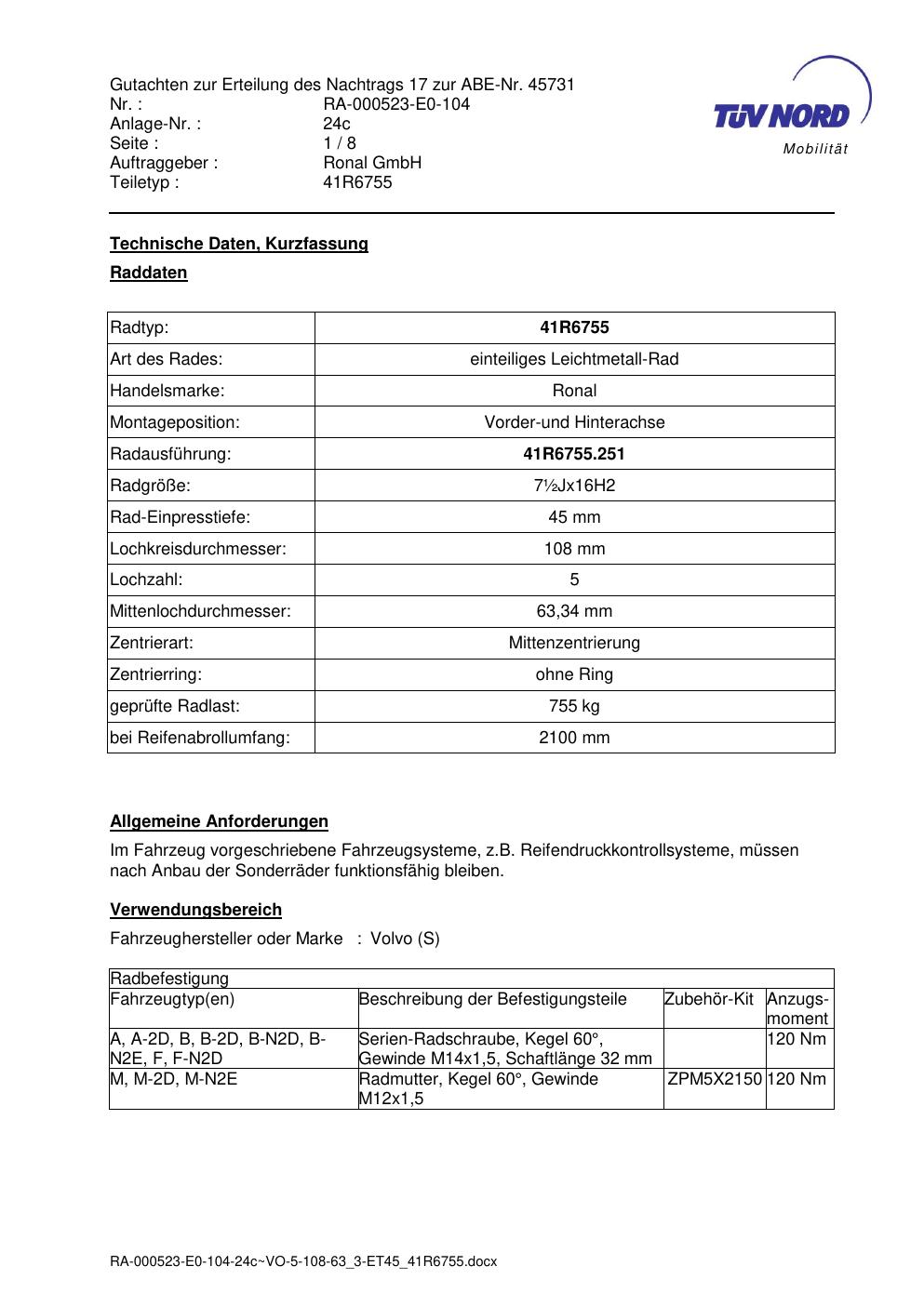 Dieses Gutachten (abe) bezieht sich auf die Alufelge brand-ronal 41R6755 in der Ausführung ET 0, Mittenloch 0 mm (KBA 45731). Im PDF findest du typischerweise zulässige Reifengrößen, Auflagen/Anbauhinweise und – je nach Dokument – Hinweise zur Eintragung.