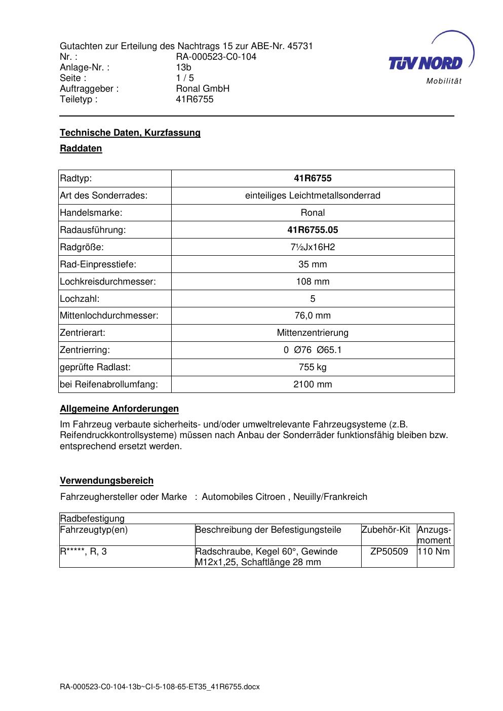 Dieses Gutachten (abe) bezieht sich auf die Alufelge brand-ronal 41R6755 in der Ausführung ET 0, Mittenloch 0 mm (KBA 45731). Im PDF findest du typischerweise zulässige Reifengrößen, Auflagen/Anbauhinweise und – je nach Dokument – Hinweise zur Eintragung.