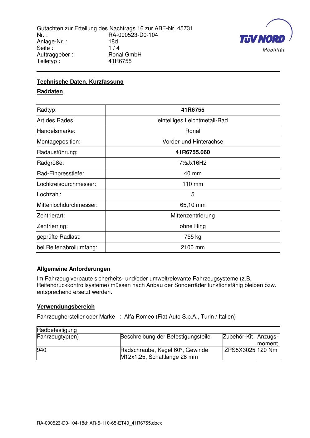 Dieses Gutachten (abe) bezieht sich auf die Alufelge brand-ronal 41R6755 in der Ausführung ET 0, Mittenloch 0 mm (KBA 45731). Im PDF findest du typischerweise zulässige Reifengrößen, Auflagen/Anbauhinweise und – je nach Dokument – Hinweise zur Eintragung.