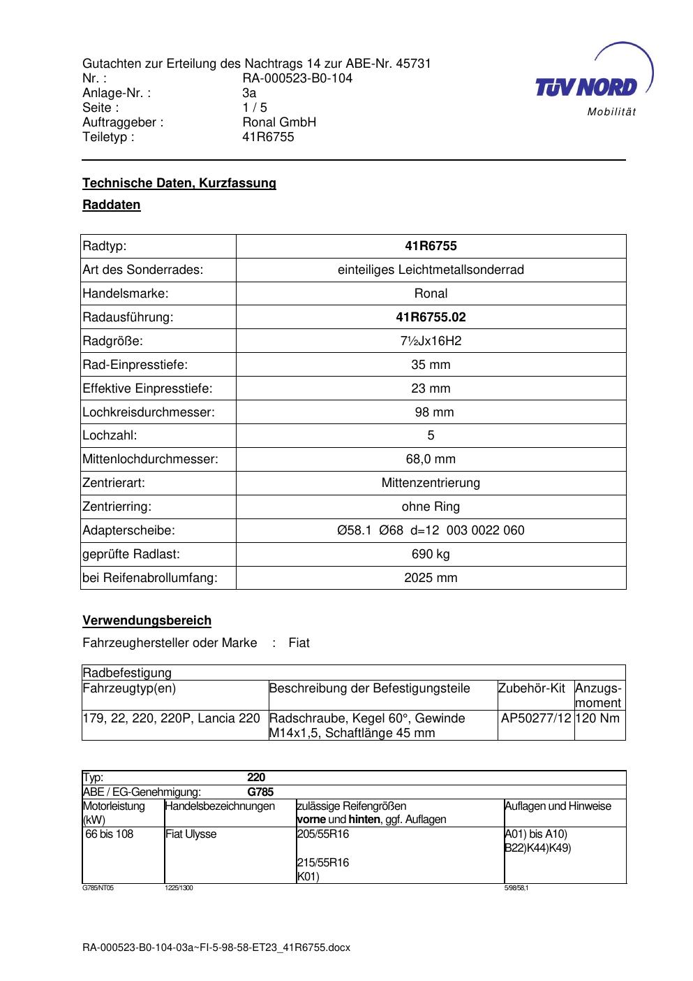 Dieses Gutachten (abe) bezieht sich auf die Alufelge brand-ronal 41R6755 in der Ausführung ET 0, Mittenloch 0 mm (KBA 45731). Im PDF findest du typischerweise zulässige Reifengrößen, Auflagen/Anbauhinweise und – je nach Dokument – Hinweise zur Eintragung.