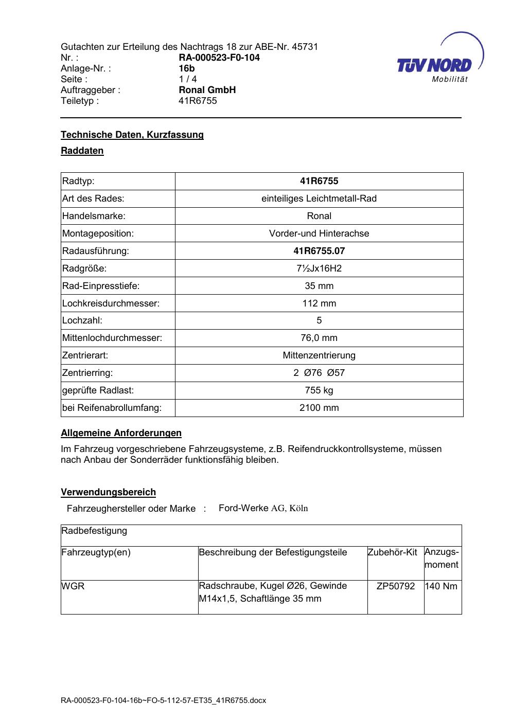 Dieses Gutachten (abe) bezieht sich auf die Alufelge brand-ronal 41R6755 in der Ausführung ET 0, Mittenloch 0 mm (KBA 45731). Im PDF findest du typischerweise zulässige Reifengrößen, Auflagen/Anbauhinweise und – je nach Dokument – Hinweise zur Eintragung.